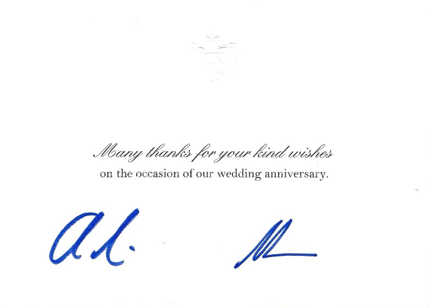 The reply is in the form of a card in English and thanks me for my wishes on their wedding anniversary and is hand signed by the couple.