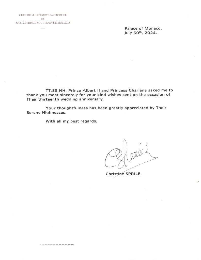Royal response from Their Serene Highnesses The Prince and Princess of Monaco on the occasion of their 13th wedding anniversary.
