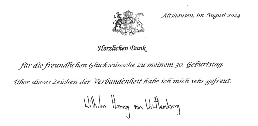 Royal response from His Royal Highness The Duke of Württemberg on the occasion of his 30th birthday.
