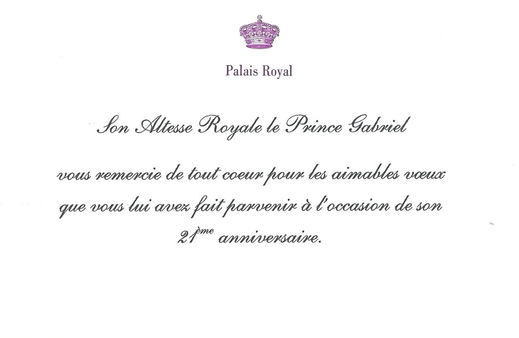 Royal response from His Royal Highness Prince Gabriel of Belgium on the occasion of his 21st birthday.