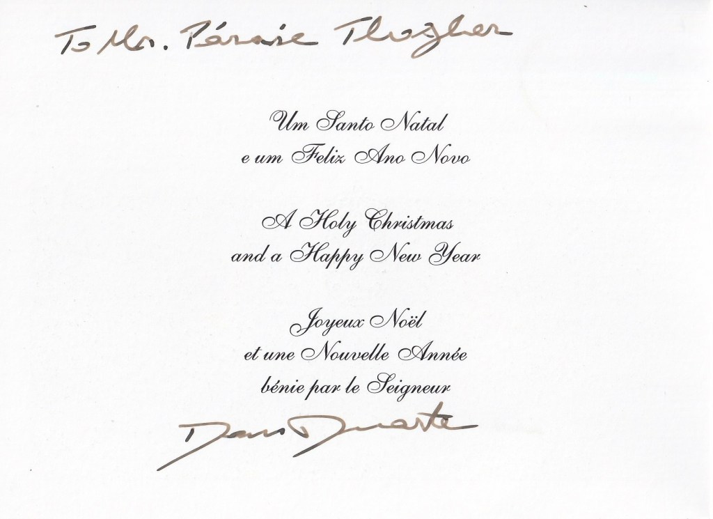 The reply is in the form of a card which on the front has the Family Coat of Arms, inside is a printed message in Portuguese, English and French, it is hand signed by The Duke. Opposite is a family picture taken by Homem Cardoso, of Their Royal Highnesses The Duke and Duchess of Braganza, Afonso, Prince of Beira, Infanta Maria Francesca with her husband Duarte Marie de Sousa Araujo Martins and Infante Dinis, Duke of Porto.