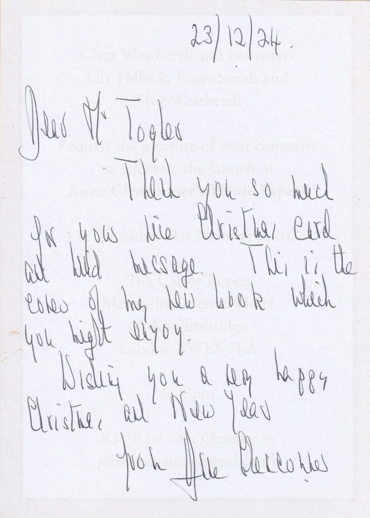 The reply is in the form of a card which on the front has the the cover of Lady Glenconner’s new book an don the reverse is a hand written message thanking me for my Christmas wishes and is hand signed by The Dowager Baroness.