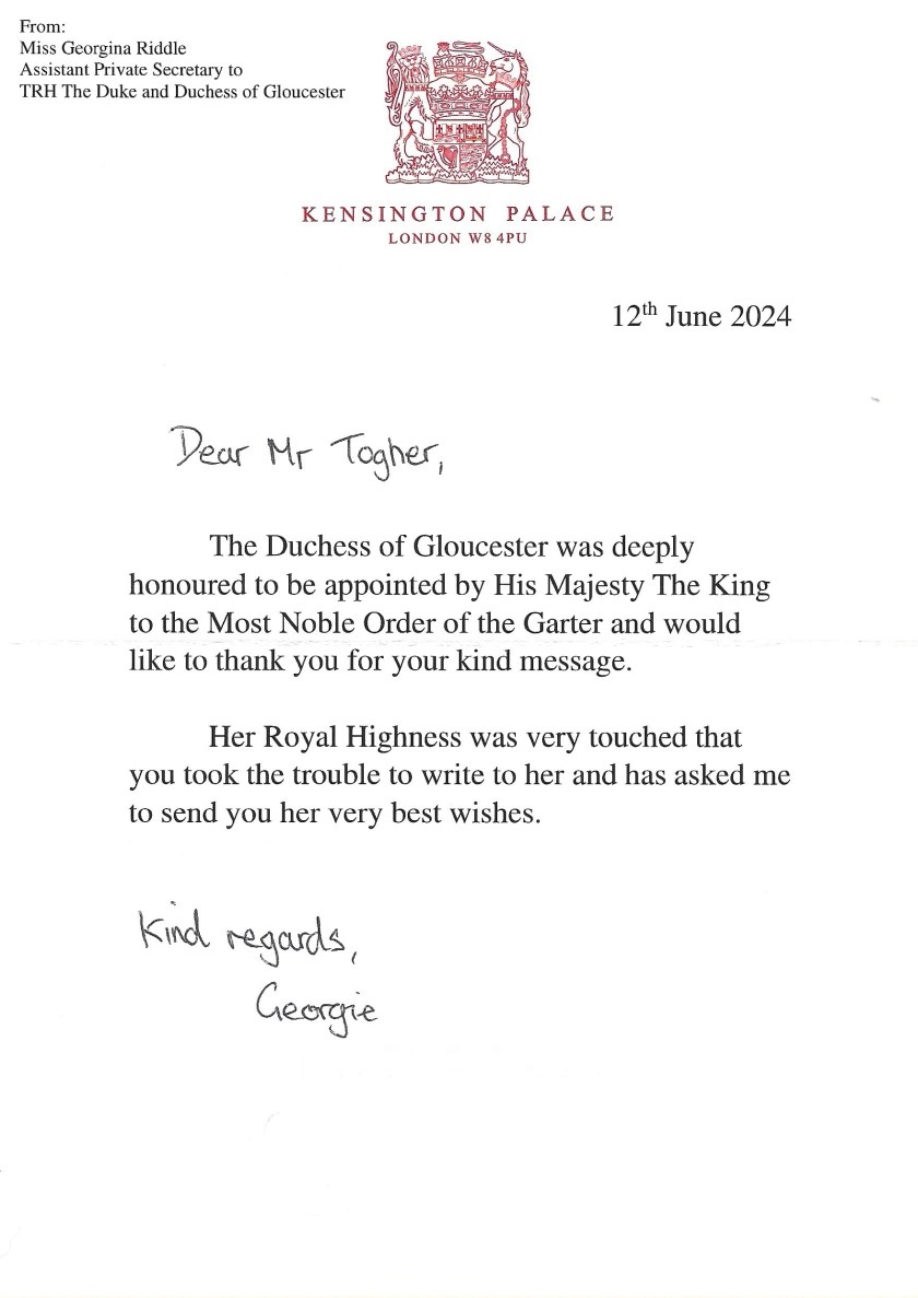 Royal response from Her Royal Highness The Duchess of Gloucester on the occasion of her appointment as a Royal Ladt Companion of The Most Noble Order of The Garter.