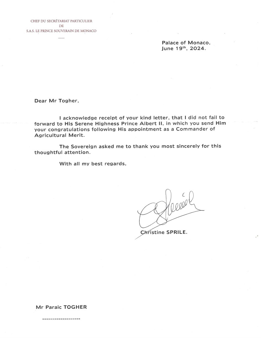 Royal response from His Serene Highness The Prince of Monaco on his appointment as a Commander of Agricultural Merit on 14th May 2024.
