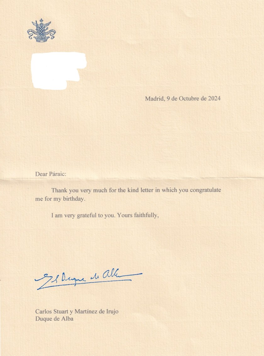 The reply is in the form of a letter thanking me for my birthday wishes and is handsigned by The Duke of Alba.