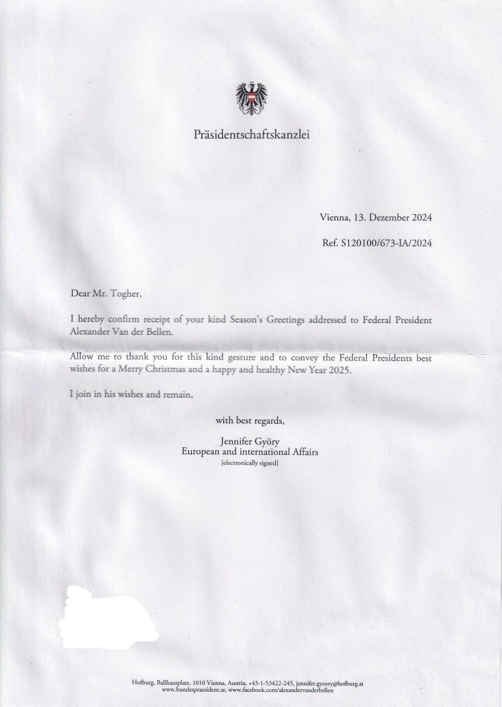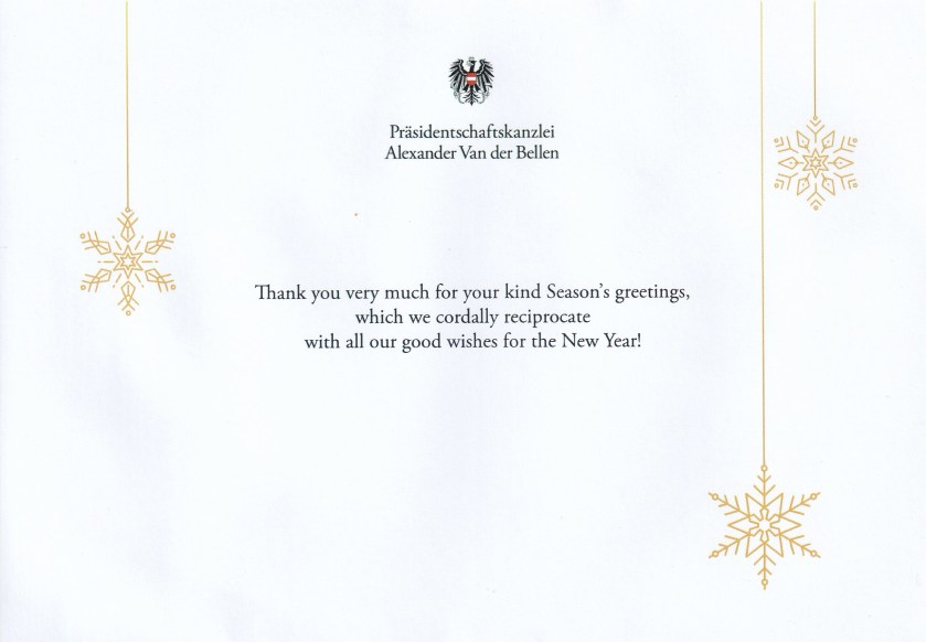 Response from His Excellency Alexander Van der Bellen, President of Austria on the occasion of Christmas 2024 and the New Year 2025.