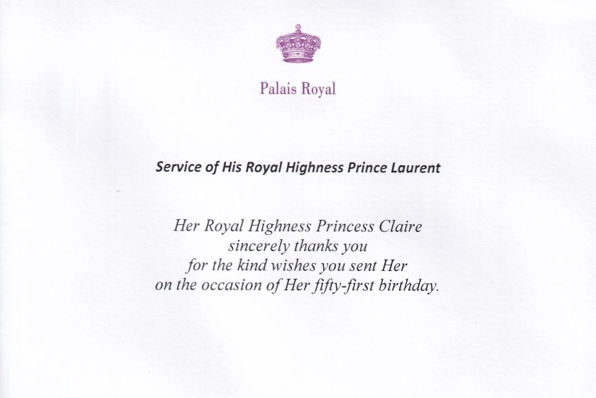 Royal response from Her Royal Highness Princess Claire of Belgium on the occasion of 51st birthday.