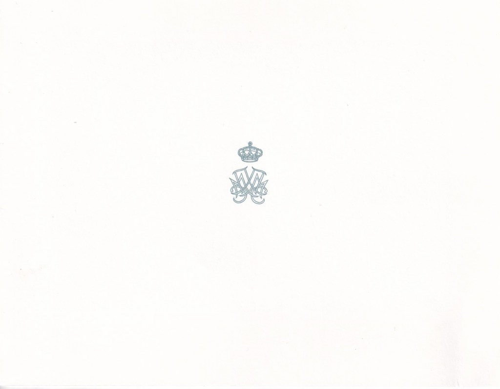 The reply is in the form of a card which on the front has the joint cypher of Their Royal Highnesses The Crown Prince and Crown Princess of Greece and inside has a picture of Their Royal Highnesses with their children and opposite is a message in English and Greek and the printed signatures of Their Royal Highnesses.