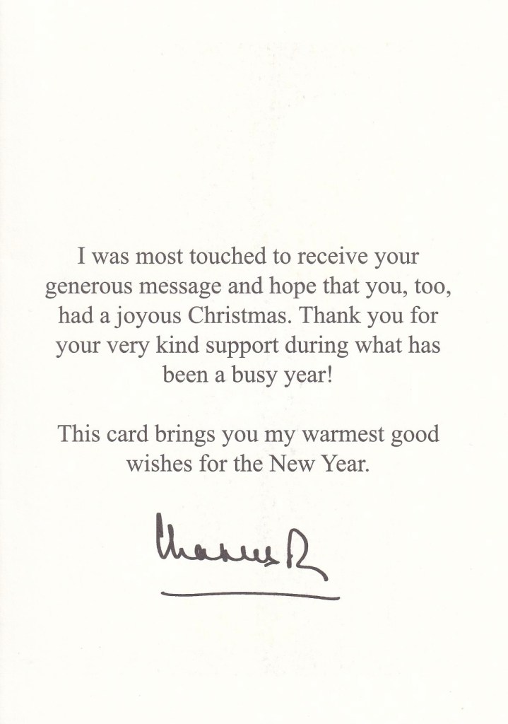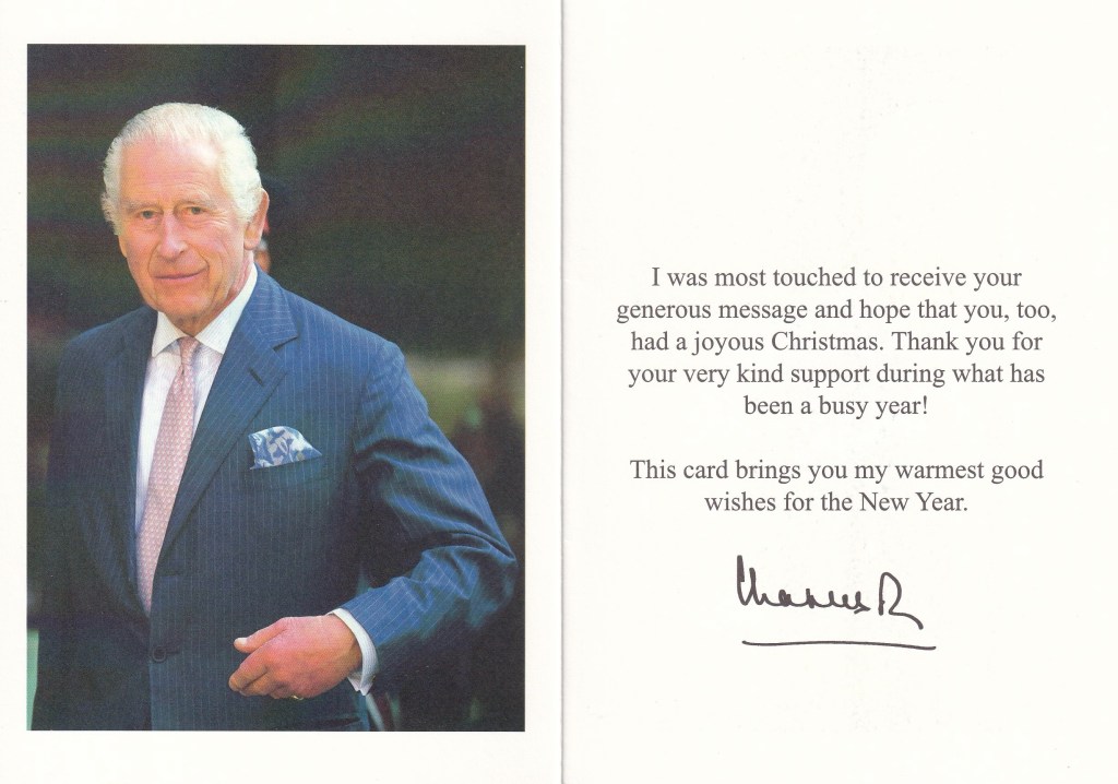 The reply is in the form of a card which on the front has His Majesty’s Cypher, inside is a picture of His Majesty taken by press association when he returned to public duties following his cancer diagnosis by visiting the University College Hospital Macmillan Cancer Centre in London with his wife Her Majesty The Queen on 30th April 2024.