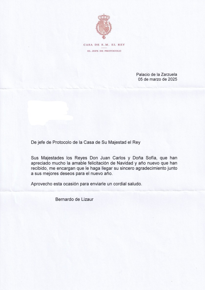 Royal response from Their Majesties King Juan Carlos I and Queen Sofia of Spain on the occasion of Christmas 2024 and the New Year 2025.