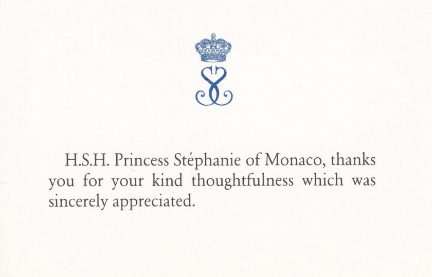 Royal response from Her Serene Highness Princess Stéphanie of Monaco on the occasion of her 60th birthday.
