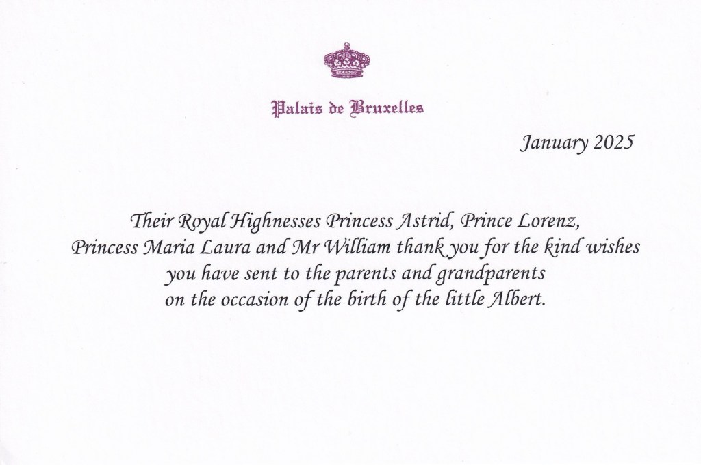 Royal response from Their Imperial and Royal Highnesses Prince Lorenz and Princess Astrid of Belgium, The Archduke and Archduchess of Austria-Este, Princess Maria Laura of Belgium, Archduchess of Austria-Este and William Isvy on the birth of their grandson/son Mr Albert Isvy.