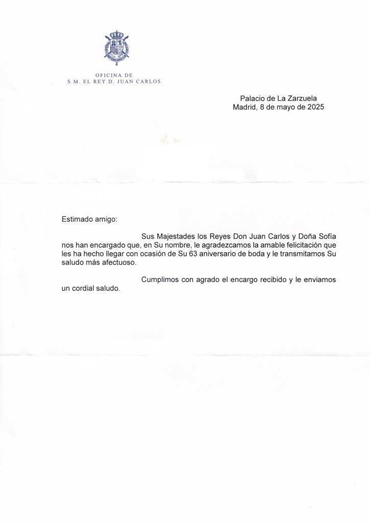 Royal response from Their Majesties King Juan Carlos I and Queen Sofia of Spain on the occasion of their 63rd Wedding Anniversary.