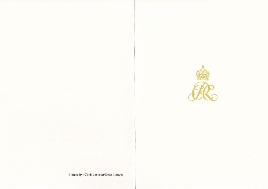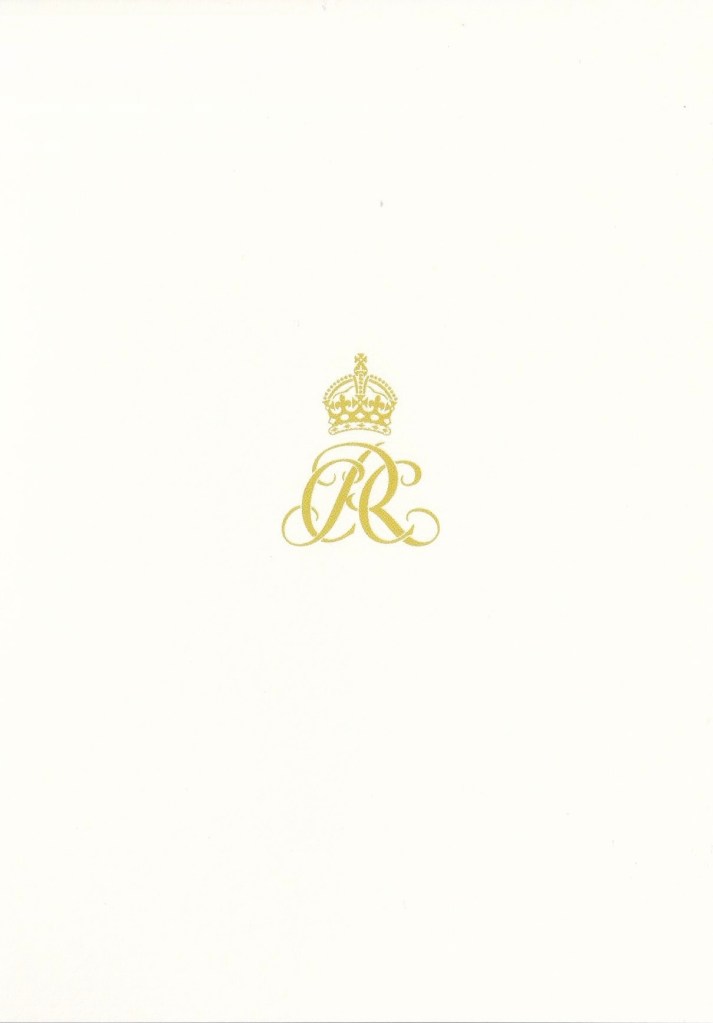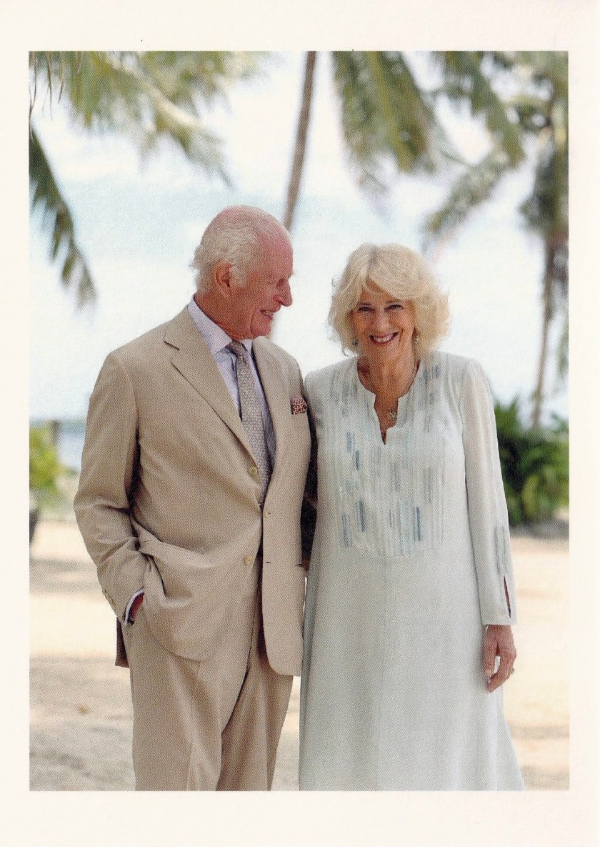 The reply is in the form of a card which on the front has Their Majesties Jpint Cypher, inside is a picture of His Majesty taken by Chris Jackson during a visit to a beach in Apia in Samoa on 25th October 2024.