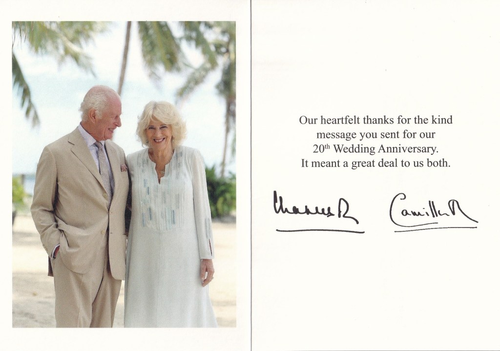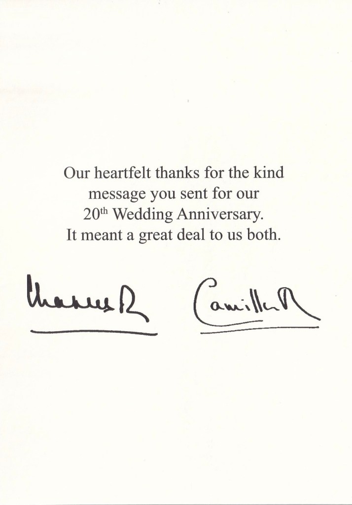Royal response from Their Majesty The King and Queen of The United Kingdom on the occasion of their 20th wedding anniversary.