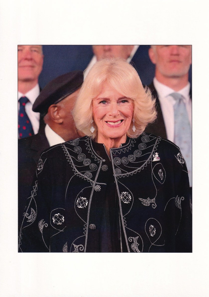 The reply is in the form of a card which on the front has a picture of Her Majesty The Queen taken by Chris Jackson at a concert to mark the 80th anniversary of VE Day at Horse Parade on 8yh May 2025. On the reverse is a message thanking me for wishes and has the printed signature of Her Majesty.