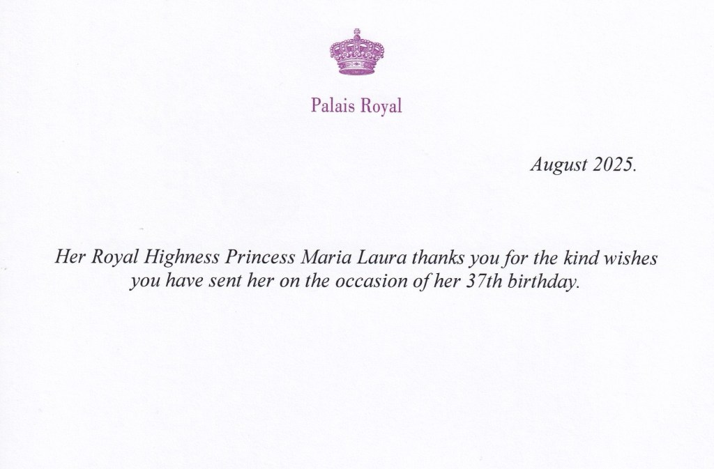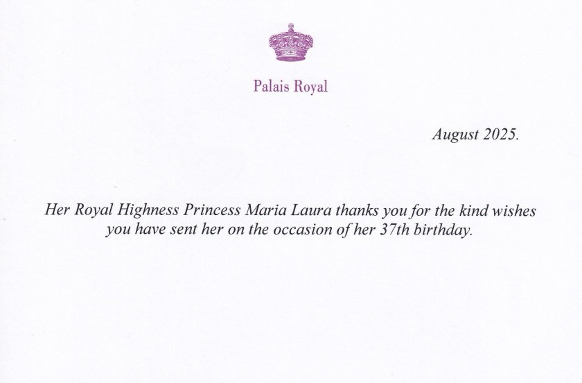 Royal response from Her Imperial and Royal Highness Princess Maria Laura of Belgium, Archduchess of Austria-Este on the occasion of her 37th Birthday.