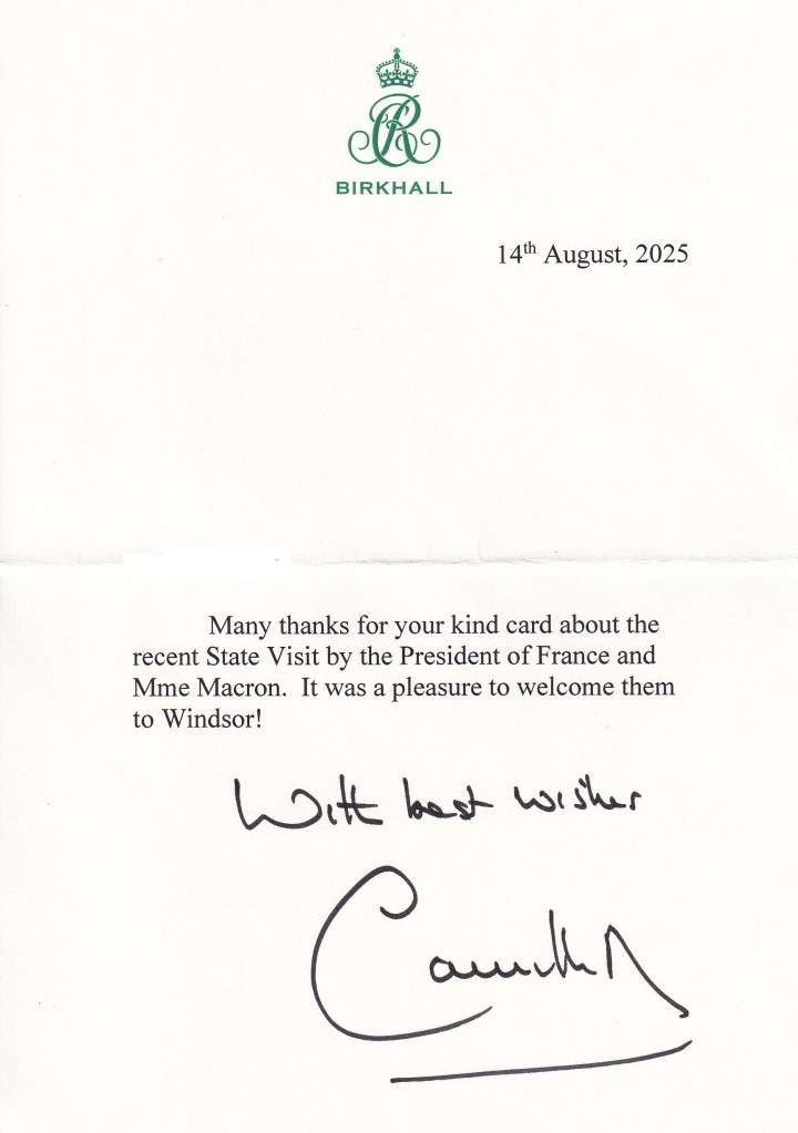 The reply is in the form of a letter thanking me for my kind wishes about The State Visit and is hand signed by Her Majesty.