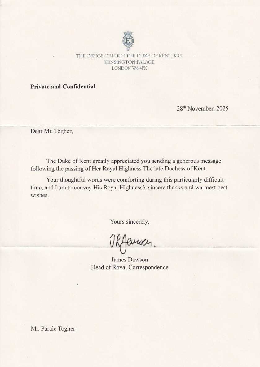 Royal response from His Royal Highness The Duke of Kent on the passing of his wife Her royal Highness The Duchess of Kent.