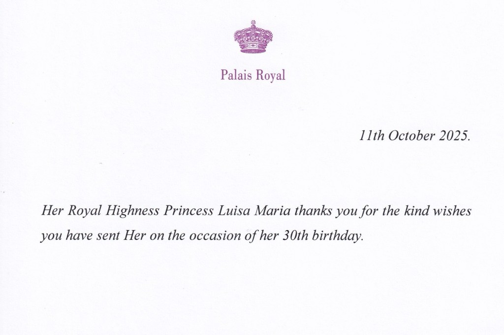 Royal response from Her Imperial and Royal Highness Princess Luisa Maria of Belgium, Archduchess of Austria-Este on the occasion of her 30th birthday.
