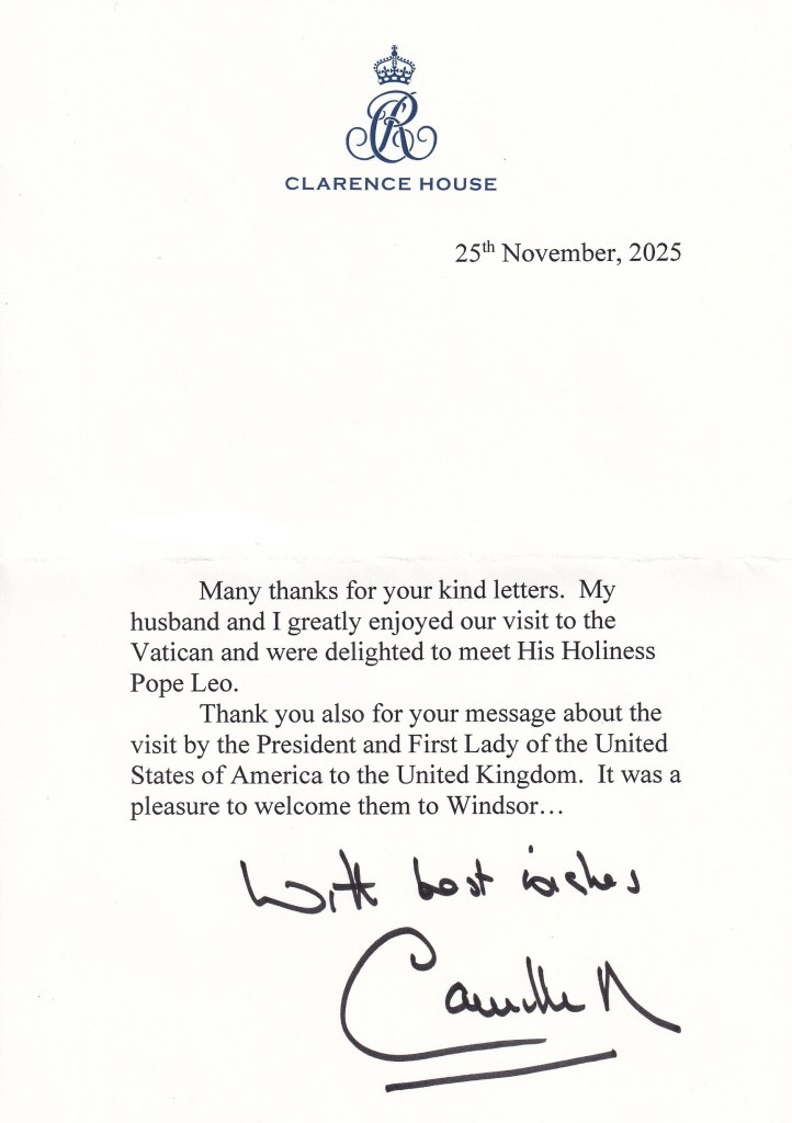 Royal response from Her Majesty The Queen of The United Kingdom on the occasion of The State Visit to The Vatican to meet His Holiness Leo XIV, The Pope and Sate Visit by Donald Trump, The President of United States of America to The United Kingdom.