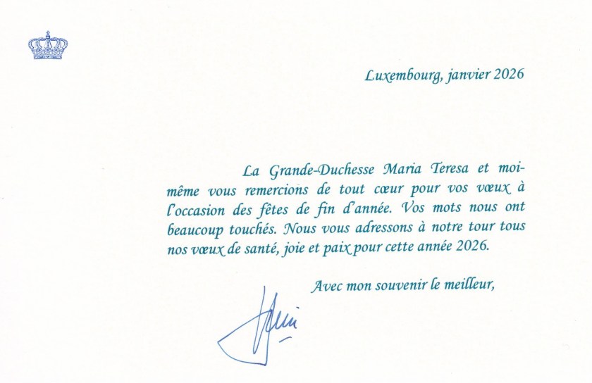 Royal response from Their Royal Highnesses Grand Duke Henri and Grand Duchess Maria Teresa of Luxembourg on the occasion of Christmas 2025 and the New Year 2026.