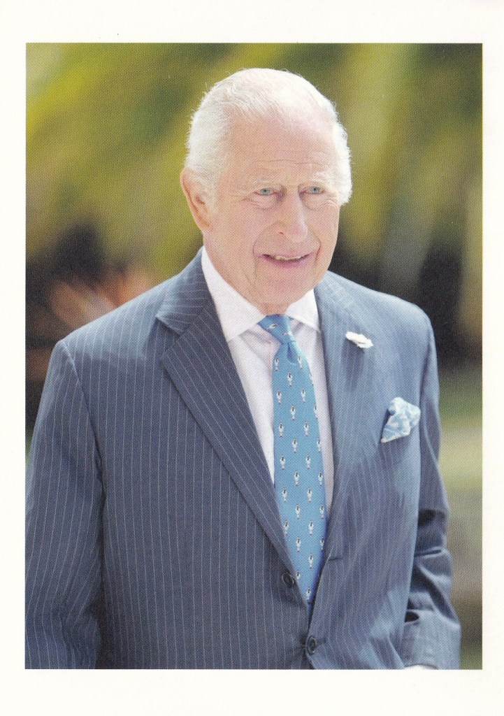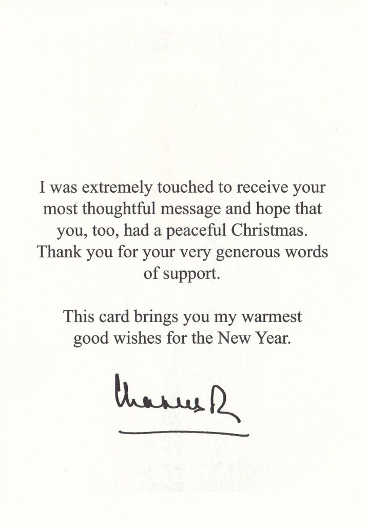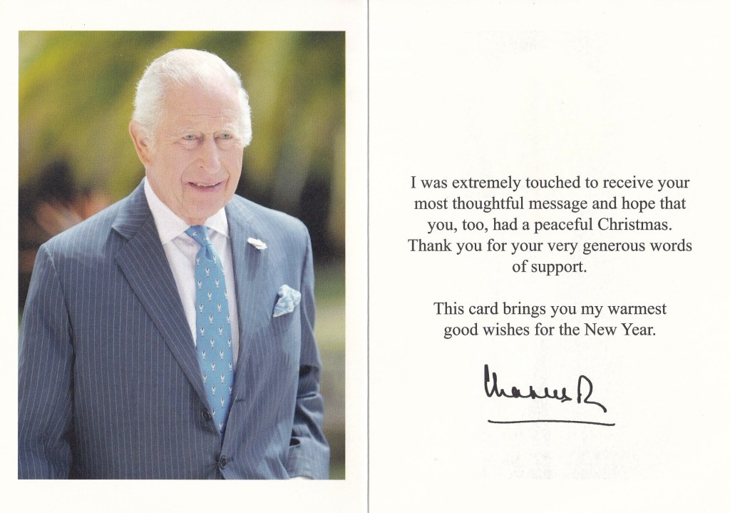 The reply is in the form of a card which on the front has His Majesty’s Cypher, inside is a picture of His Majesty taken by Chris Jackson attends a nature and finance reception at Lancaster House on 25th June 2025.