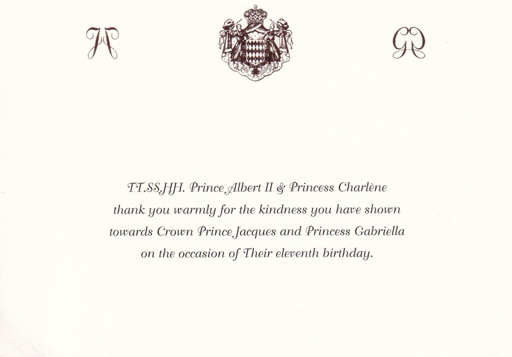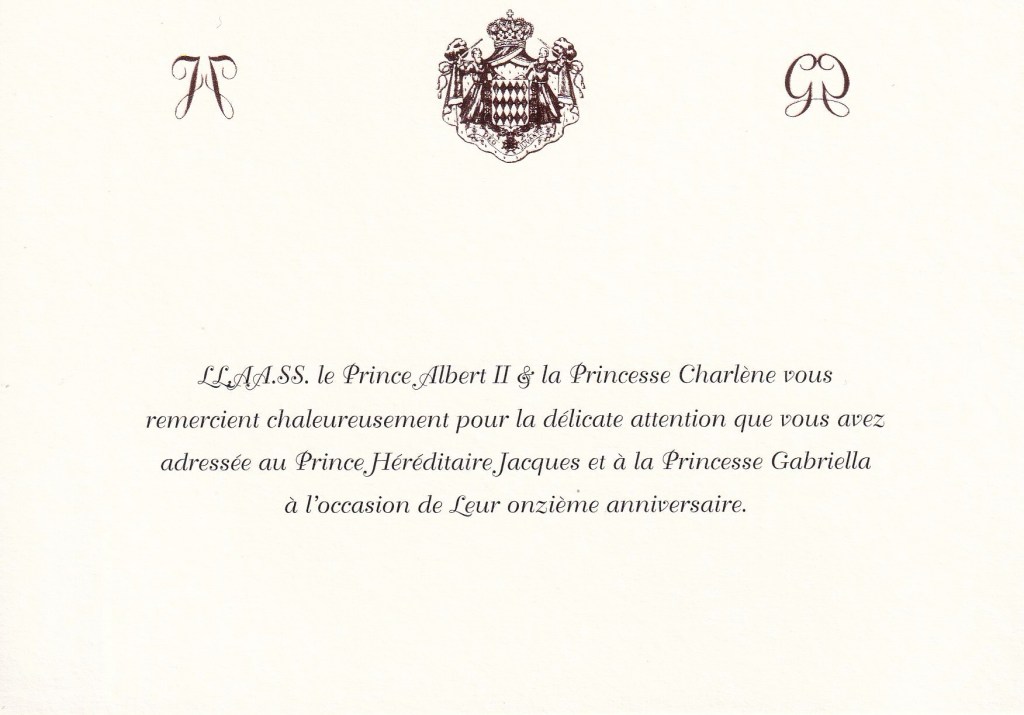 The reply is in the form of a double sided card, pme side been in English and the other in French. On top is is the Crest of The Kingdom of Monaco and The Monograms of Their Serene Highnesses Jacques, Hereditary Prince of Monaco, Marquis of Baux and Princess Gabriella, Countess of Carladès.