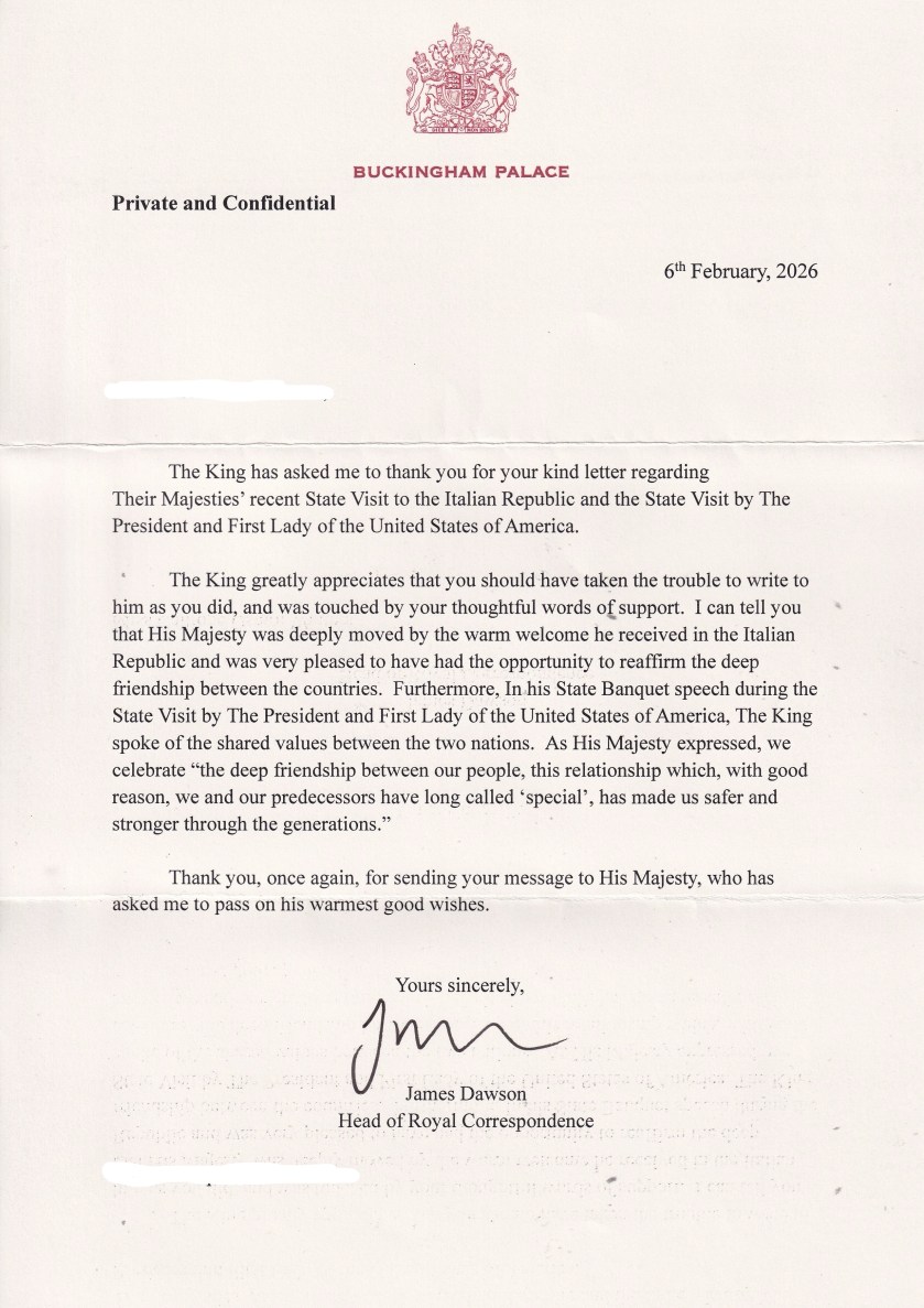 The reply is in the form of a letter thanking me for my kind wishes about The State Visits.