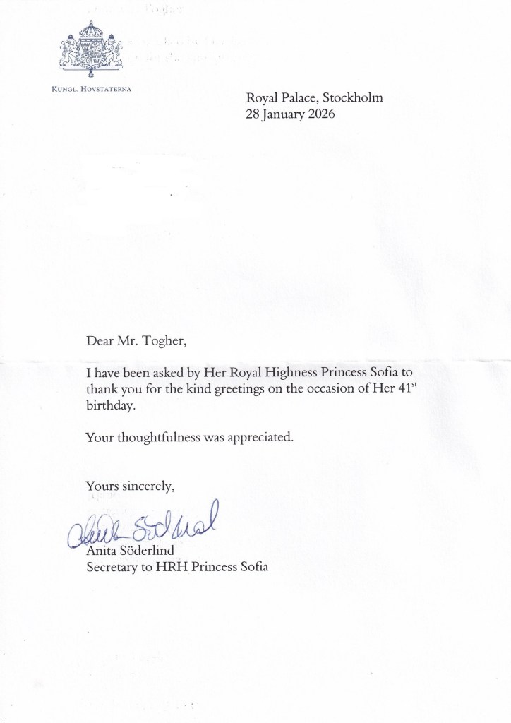 Royal response from Her Royal Highness Princess Sofia of Sweden, Duchess of Värmland on the occasion of her 41st birthday.