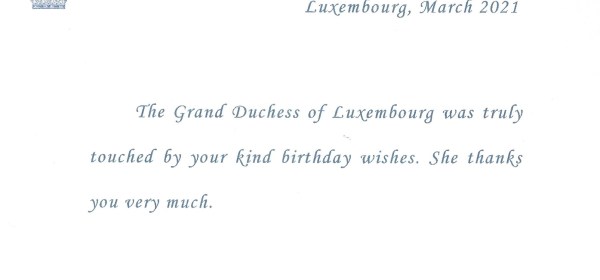 Royal response from Her Royal Highness The Grand Duchess of Luxembourg on the occasion of her 65th birthday. Born Maria Teresa on 22nd March 1956