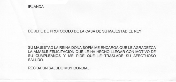 Royal response from her Majesty Queen Sofia of Spain on the occasion of her 82nd Birthday. Born Princess Sophia of Greece and Denmark, she was