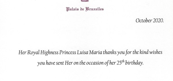 Royal response from Her Imperial and Royal Highness Princess Luisa Maria of Belgium, Archduchess of Austria-Este on the occasion of her 25th birthday. Born Luisa