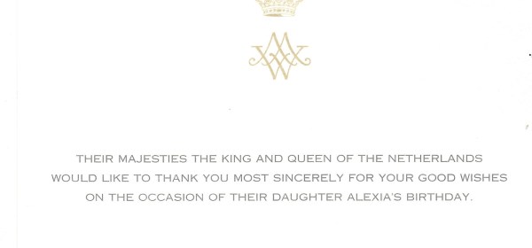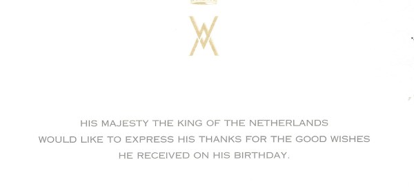 Royal response from The King of The Netherlands on the occasion of his 51st birthday. His Majesty is the son of then Their Royal Highnesses