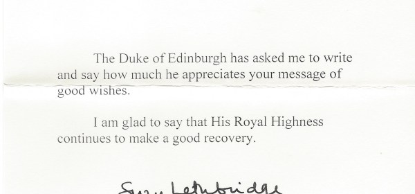 Response from His Royal Highness The Duke of Edinburgh thanking me for the get well soon wishes I sent following his hip surgery. Letter Envelope
