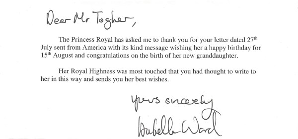 First Christmas Response is here. A letter From Her Royal Highness The Princess Royal. It is written by Isabella Ward secretary to The Princess Royal