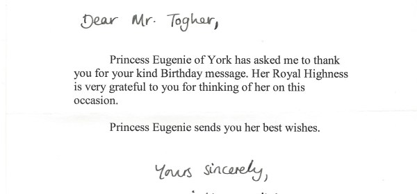 Royal Response from the office of The Duke of York on the occasion of his daughter Princess Eugenie’s 28th birthday. it is a letter signed