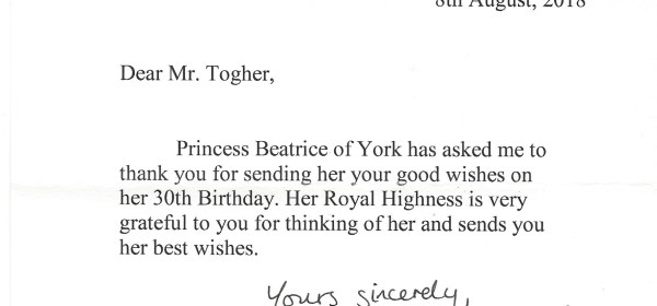 Royal Response from the office of The Duke of York on the occasion of his daughter Princess Beatrice’s 30th birthday. it is a letter signed