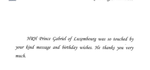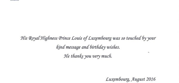Royal response from His Royal Highness Prince Louis of Luxembourg on the occasion his 30th birthday. Born Louis Xavier Marie Guillaume on 3rd August 1986