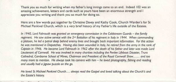 Response from The Right Honourable Evelyn Boscawen, The 10th Viscount Falmouth, on the passing of his father George Boscawen, The 9th Viscount Falmouth. Born George