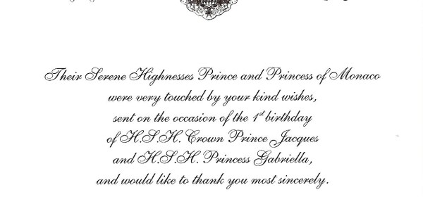 Royal response from Their Serene Highnesses The Prince and Princess of Monaco on the first birthday of their children Their Serene Highnesses Jacques, Hereditary Prince