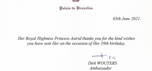 Royal response from Her Imperial and Royal Highness Princess Astrid of Belgium, Archduchess of Austria-Este on the occasion of her 59th birthday. Born Astrid Joséphine-Charlotte