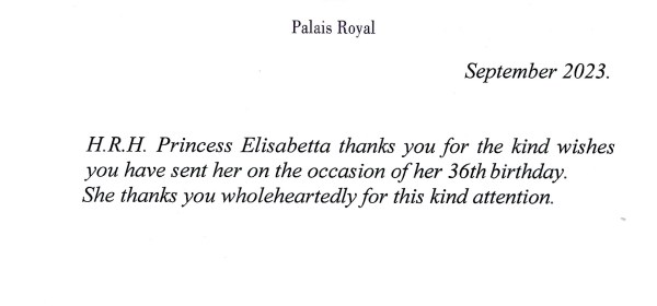 Royal response from Her Imperial and Royal Highness Princess Elisabetta of Belgium, Archduchess of Austria-Este on the occasion of her 36th birthday. Born Elisabetta Maria