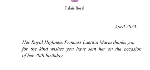 Royal response from Her Imperial and Royal Highness Princess Laetitia Maria of Belgium, Archduchess of Austria-Este on the occasion of her 20th birthday. Born Laetitia