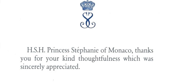 Royal response from Her Serene Highness Princess Stéphanie of Monaco on the occasion of her 58th birthday. Born Stéphanie Marie Elizabeth on 1st February 1965