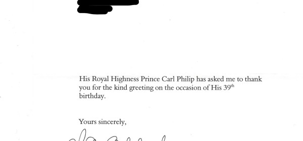 First reply from Sweden was for the 39th Birthday of HRH Prince Carl Philip. It is a letter, no picture signed by his Secretary. Letter