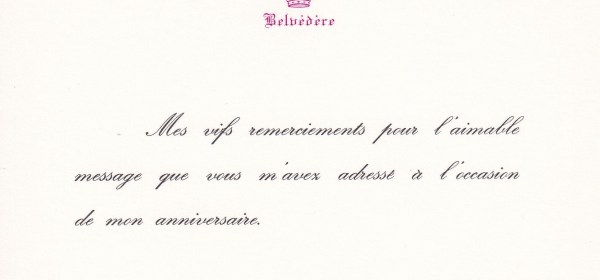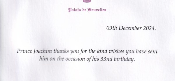 Royal response from His Imperial and Royal Highness Prince Joachim of Belgium, Archduke of Austria-Este on the occasion of his 33rd birthday. Born Joachim Karl-Maria
