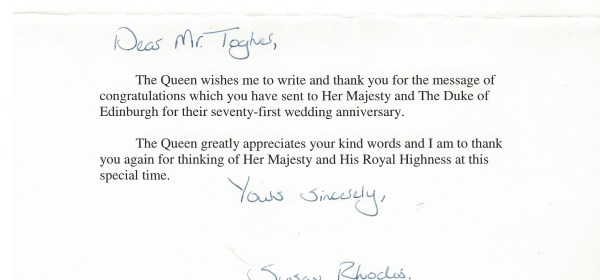 Royal response from Her Majesty The Queen on the occasion of her 71st Wedding anniversary reply. Her Majesty The Queen, then Her Royal Highness The