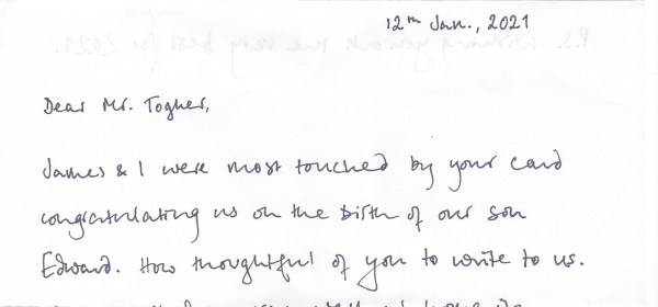 Response from The Honourable James and Sophie Law on the birth of their son Edward. Born Edward Thomas Carmichael on 30th December 2020. The Honourabke