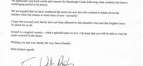 Response from Francis Watson-Armstrong of Bamburgh Castle in reply to a letter i sent about the Corona Virus and its effects on The castle and